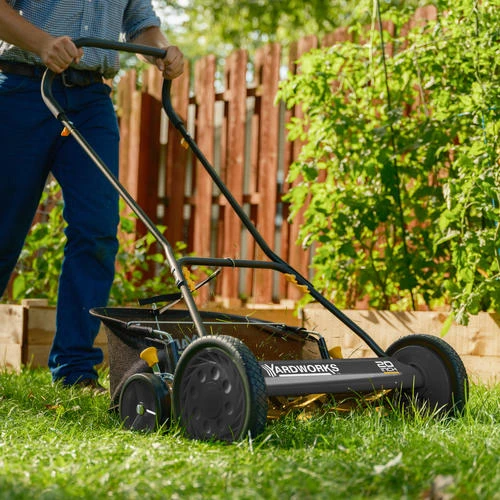 The Yardworks™ reel push lawn mower with trailing wheels has a 20″ cut. There’s no noise while cutting your lawn and it features easy height adjustment with a single lever control. No oil or gas is needed. This mower is emissions-free. Yardworks™ is the clean air choice.