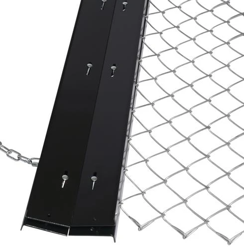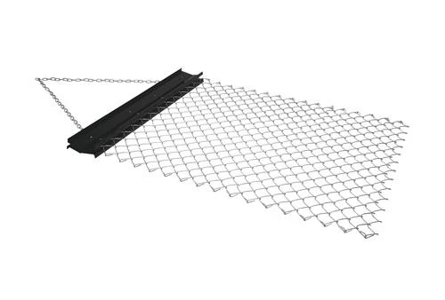 The Yardworks Tow-behind Drag Harrow Mat is ideal for leveling soil and seeding. Has a 4 ft. W x 5 ft. L mat and adjustable front tray allows for loading up to 8 inch concrete blocks for extra weight. High-quality steel mesh with durable galvanized, rust resistant finish. Quick-connect link for easy and secure attaching. Mesh mat can be rolled up for easy storage