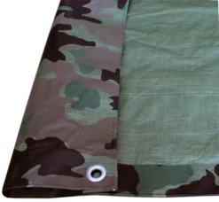 Protect your belongings with this rope-reinforced, 6′ x 8′ camouflage, medium-duty poly tarp with heat-sealed hems on all sides. The tarp features rustproof grommets every three feet and also on each corner. It is water and tear-resistant for all-weather protection. The tarp also retains flexibility at all times even at freezing temperatures.
