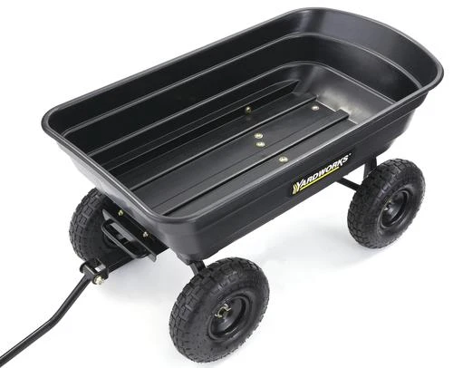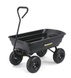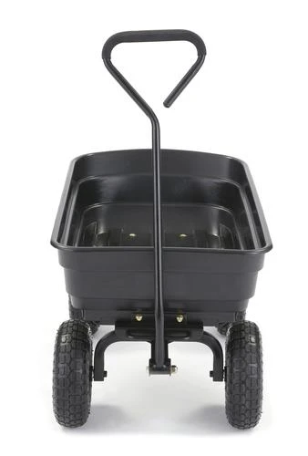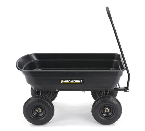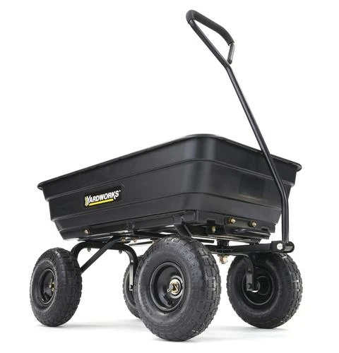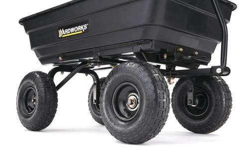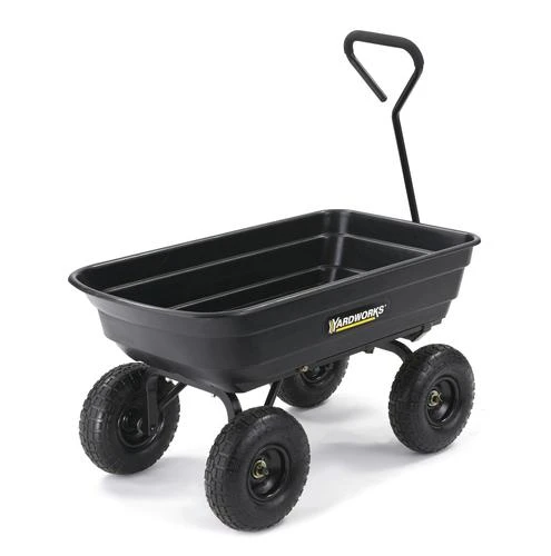 Hauling items around your yard and garden has never been easier with this 600-pound capacity dump cart. It features 10-inch pneumatic tires for easy maneuverability over varying terrain and a balanced dumping feature for quick and easy unloading of soil, rock, mulch, and more! The bed is made of maintenance-free polyurethane so it won’t rust and cleans easily.